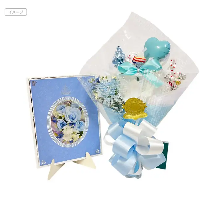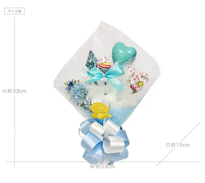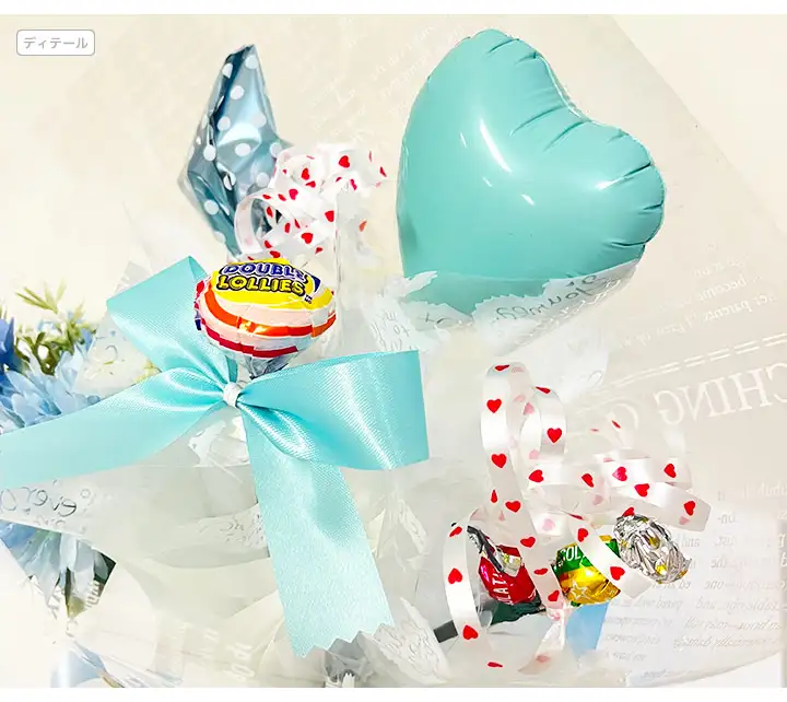 キャンディーやチョコレートなど可愛いお菓子たちをお花のようにアレンジしました。優しさを感じるパステルブルー調で、シンプルかつ華やかなデザイン。フラワーブーケをあしらった爽やかな「ロイヤルローズブルー」台紙を添えて贈ります。